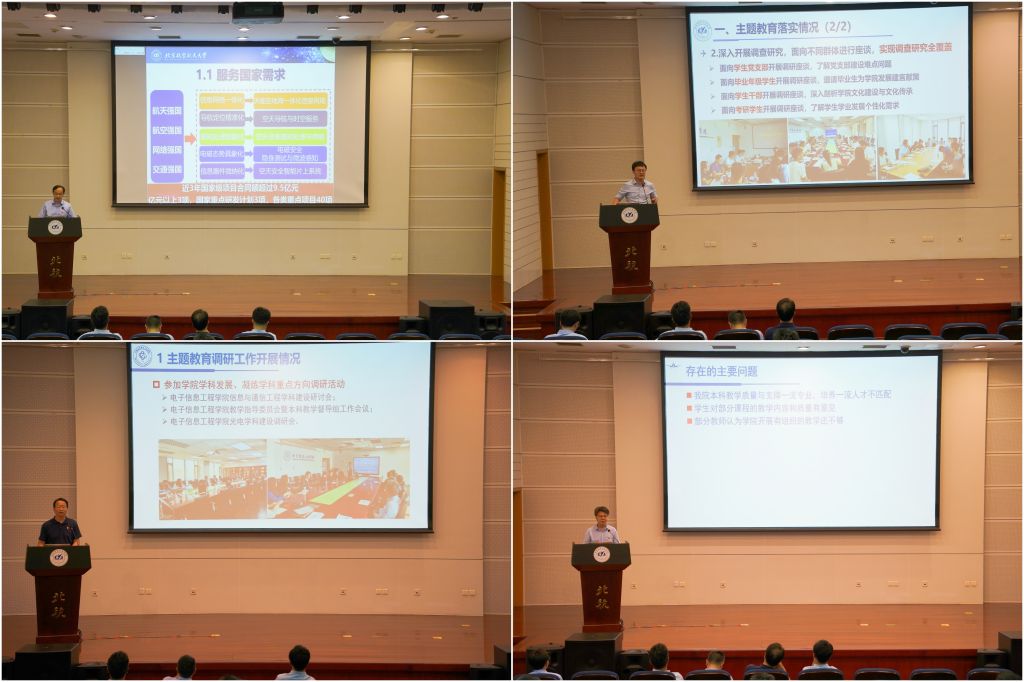 学院党委书记徐亚军讲授主题教育专题党课。带领大家进一步深入学习习近平新时代中国特色社会主义思想,深刻认识开展主题教育的重要意义。他指出,学院全面把握主题教育的目标要求,以突出问题为导向,深入调查研究,探索整改举措。学院针对学科建设、内设机构设置、科教协同平台建设,提升教育教学质量等问题,以党建为引领,集中精力进行整改整治,并着力推进教育、科技、人才一体化平台建设,为学院发展保驾护航。他最后强调,要以习近平新时代中国特色社会主义思想凝心铸魂,以推动学院高质量内涵式发展的新成效检验主题教育成果,为教育强国、科技强国、人才强国贡献北航力量。