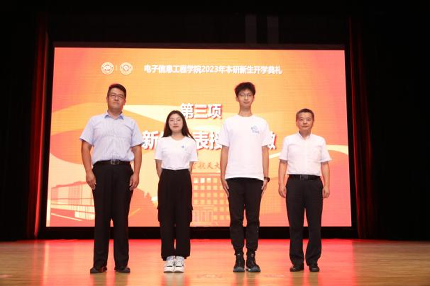 典礼上,徐亚军、曹先彬向本研新生代表授予院徽。全体新生将院徽郑重地佩戴在胸前,正式成为一名电子人。