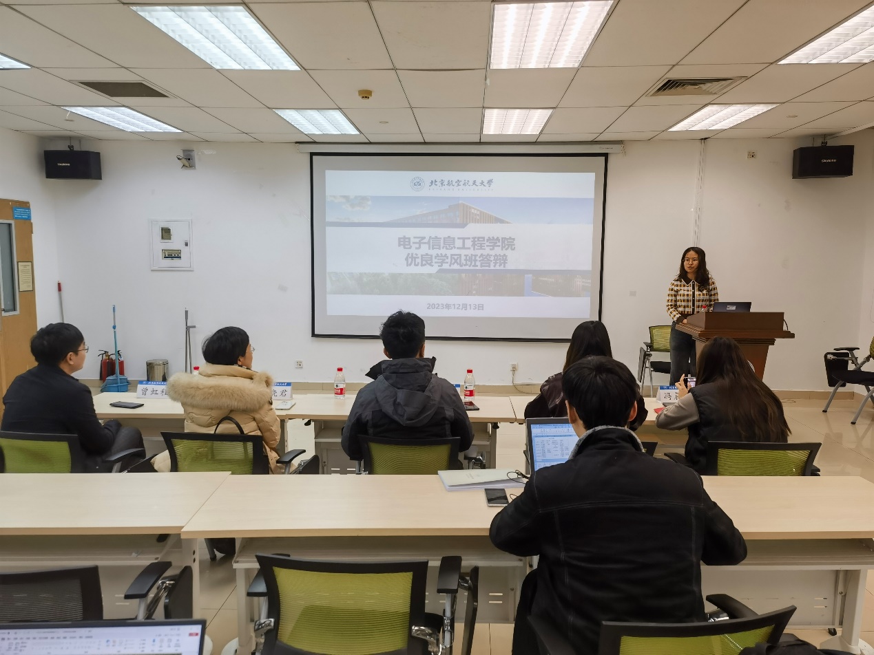 2023年12月13日下午14点,北航威尼斯9499登录入口在新主楼F708举行2022-2023学年优良学风班评选答辩会。本次会议邀请学院党委副书记姜宇老师、本科生班主任吴晓君老师、曾虹程老师,华东政法大学冯晨音老师、黄小园老师、学院本科生兼职辅导员担任评委。会议由奖助贷辅导员吴欣雨主持。