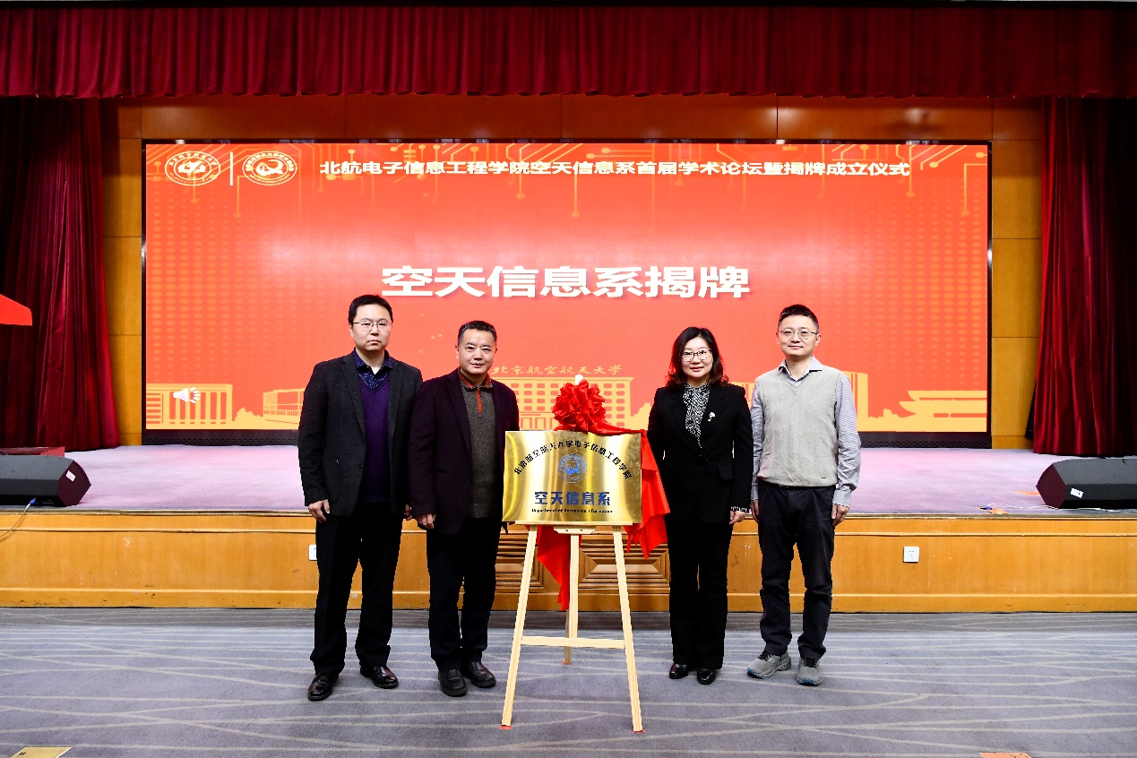 随后,副校长邓怡、院长曹先彬、学科方向带头人徐迈、系主任于泽共同为空天信息系揭牌。与会嘉宾与空天信息系老师合影留念。