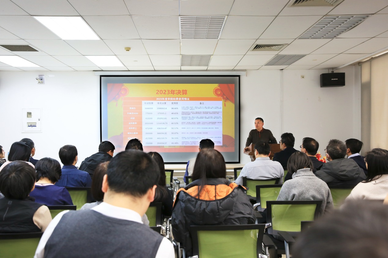 曹先彬院长对2023年的工作进行了全面的回顾和总结,并对学院2023年决算及2024年预算情况进行公示说明。他表示,2023年在全院教职工的共同努力下,学院各项工作均取得了一系列令人振奋的成绩,号召大家2024年继续同心同行,紧抓机遇,着力推进学院综合改革的优化建设,为学院和学校的发展注入更多的活力。
