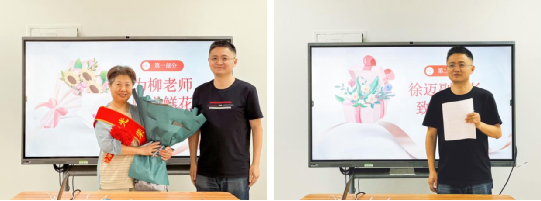 欢送会第一项,徐迈副院长为柳老师献花并致欢送辞。2003年,柳老师从录入成绩学起,逐步成长为业务熟练的教务秘书,一干就是21年。21年中,柳老师始终牢记使命扎实做,保障教学稳运行;始终积极参与用心做,助力培养新模式;始终心系师生主动做,甘为温度机关人。柳老师严谨的工作态度、精湛的业务能力和无私的奉献精神赢得了全院师生的高度评价和衷心感谢。