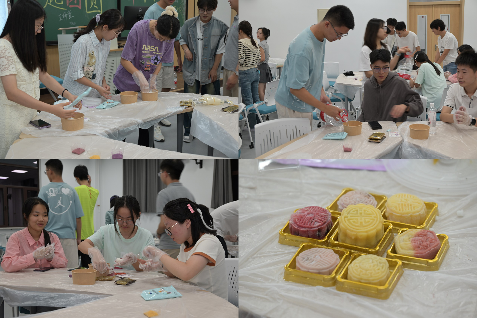 主持人首先向大家介绍了中秋节的起源与传统,讲述了古人如何通过赏月寄托思念之情。接下来,主持人详细讲解了月饼的制作方式,带领大家一起开始手作月饼。同学们四人一组自由组队,倒水,和面,找准比例,用面粉把月饼皮染成自己喜欢的颜色,把面团揉捏筋道,包上喜欢的馅料,再放入模具按压成型,一个冰皮月饼就新鲜出炉了。同学们做出来的月饼个个圆润饱满、色泽诱人,大家沉浸其中,欢声笑语从未停歇。