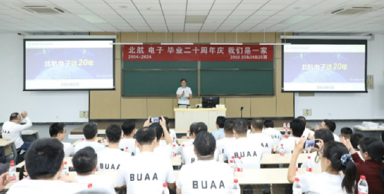 接着校友代表、电子信息工程学院副院长蔡开泉做了一场“北航电子这20年”的主题报告。蔡开泉从学科建设、师资力量、科研成果、人才培养、校友成就等方面详细介绍了学院二十年来的发展,让大家感受到了学院近二十年来取得的巨大成绩。