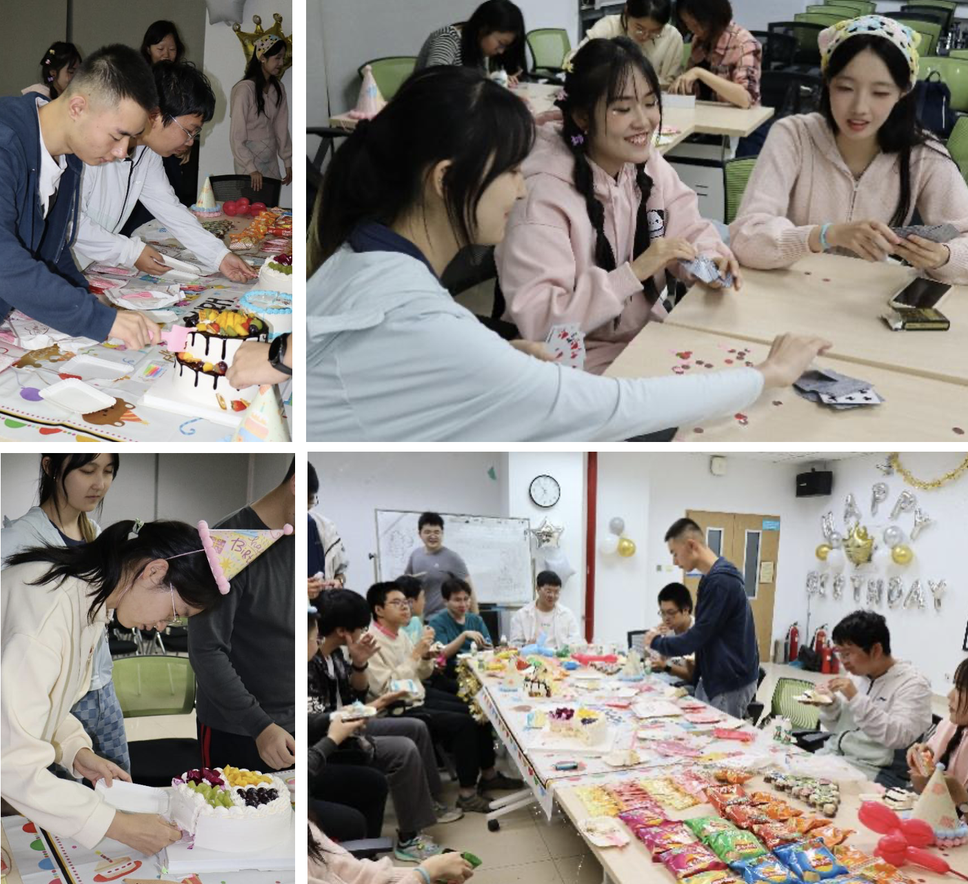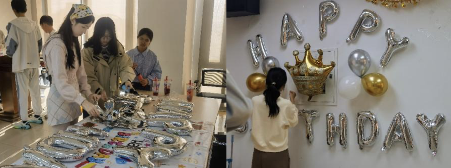 在生日会开始之前,学生会成员们早早来到活动场地,为生日会布置现场。现场忙碌而温馨,五彩缤纷的气球、精美的生日墙、丰盛的零食和甜美的蛋糕,这一切共同勾勒出一幅温馨而美好的画面,让人不由自主地被这份浓浓的喜悦与温情所包围,这是一场关于友情、欢笑与成长的美好庆典。