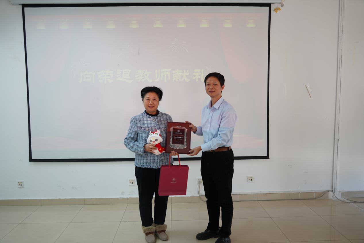 会议第四项,教师荣休。柳海燕老师发表退休感言,柳老师回顾了自己在学院工作的岁月,表达了对学院和同事们的深深眷恋,并衷心感谢学院和学同事们一直以来的关心和支持,表示虽然即将离开工作岗位,但会永远珍惜这段宝贵的经历并一直关注学院的发展。戴飞书记为柳海燕老师颁奖,并代表学院对荣休教师致以衷心的感谢。