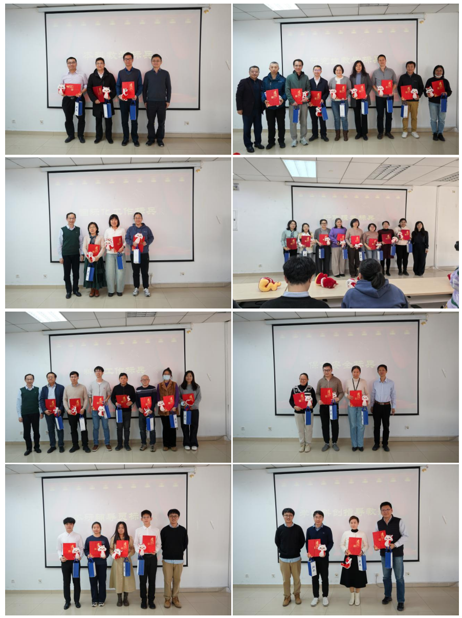 会议第二项,表彰环节。学院领导班子成员分别为“本科教学标兵”、“研究生教学标兵”、“国际化工作标兵”、“行政服务标兵”、“科研工作标兵”、“保密安全标兵”、“本研辅导员标兵”、“学生科创指导教师”等多个奖项的师生代表颁奖。