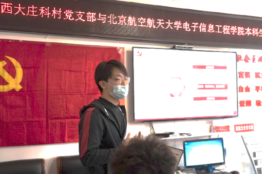 首先,电子学院本科生第三党支部副书记解天一同志为大家介绍了本次红色1+1活动的背景,并讲述了以支部成员李海涛、徐申展等为代表的北航冬奥志愿者,在冬奥服务保障期间的坚守场馆重要岗位、利用专业优势助力岗位工作的事迹。西大庄科村党支部书记徐建喜讲述了西大庄科村自2013年以来,全程参与北京冬奥会延庆赛区的场馆选址、防火护林、巡护救援、腾退拆迁、赛事保障的故事。