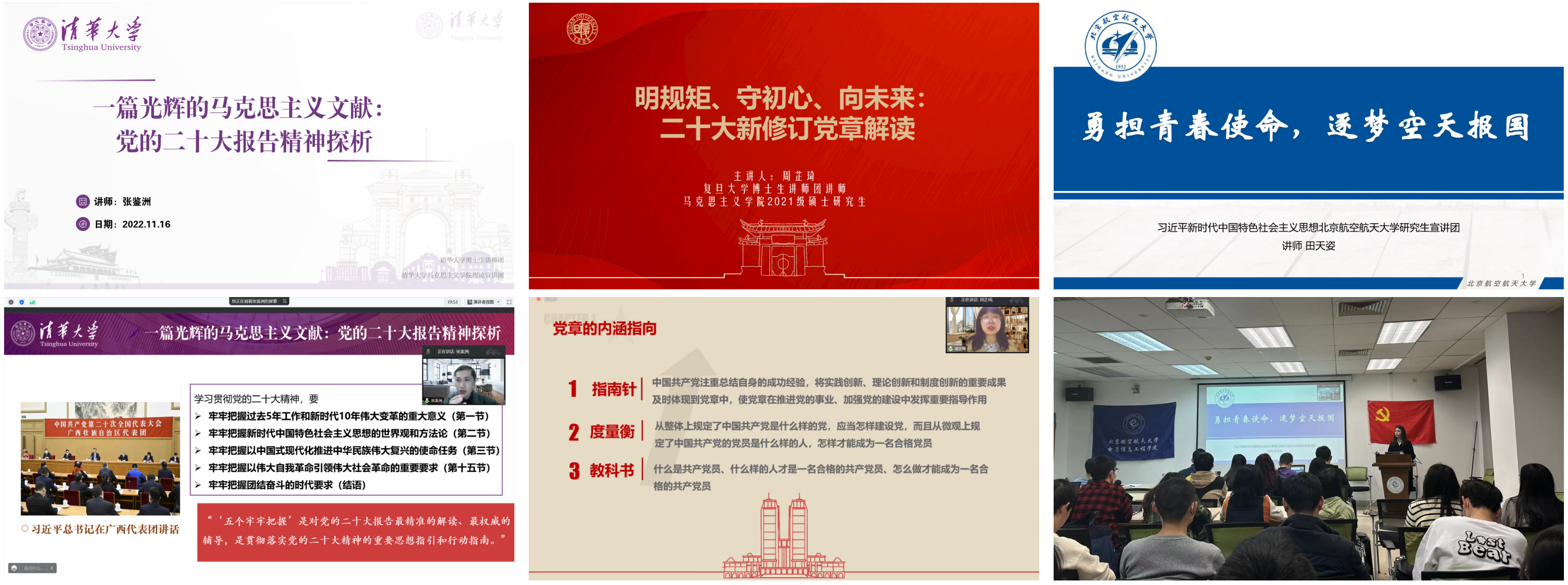 会上,2020年全国青马工程高校班学员、清华大学博士生讲师团讲师张鉴洲围绕习近平总书记提出的“五个牢牢把握”,对党的二十大报告进行提纲挈领式地解读,帮助同学们更好的理解二十大的重大理论创新内容。复旦大学博士生讲师团讲师周芷琦通过新旧党章内容对照领学,带领大家深入解读新修订的《党章》,梳理中国共产党以党章修订规范党员和党组织行为、回应时代发展中心任务变化的最新成果,深刻揭示中国共产党“过去为什么能够成功,未来如何继续成功”。今年正值北航建校70周年,七十年栉风沐雨、七十载空天报国,从理论到实践、从深入学习到生动践行,北航研究生宣讲团讲师田天姿带领大家从我校七十年奋斗历程中沉淀下来的精神财富中寻找青春答案,鼓励大家勇担青春使命,逐梦空天报国。