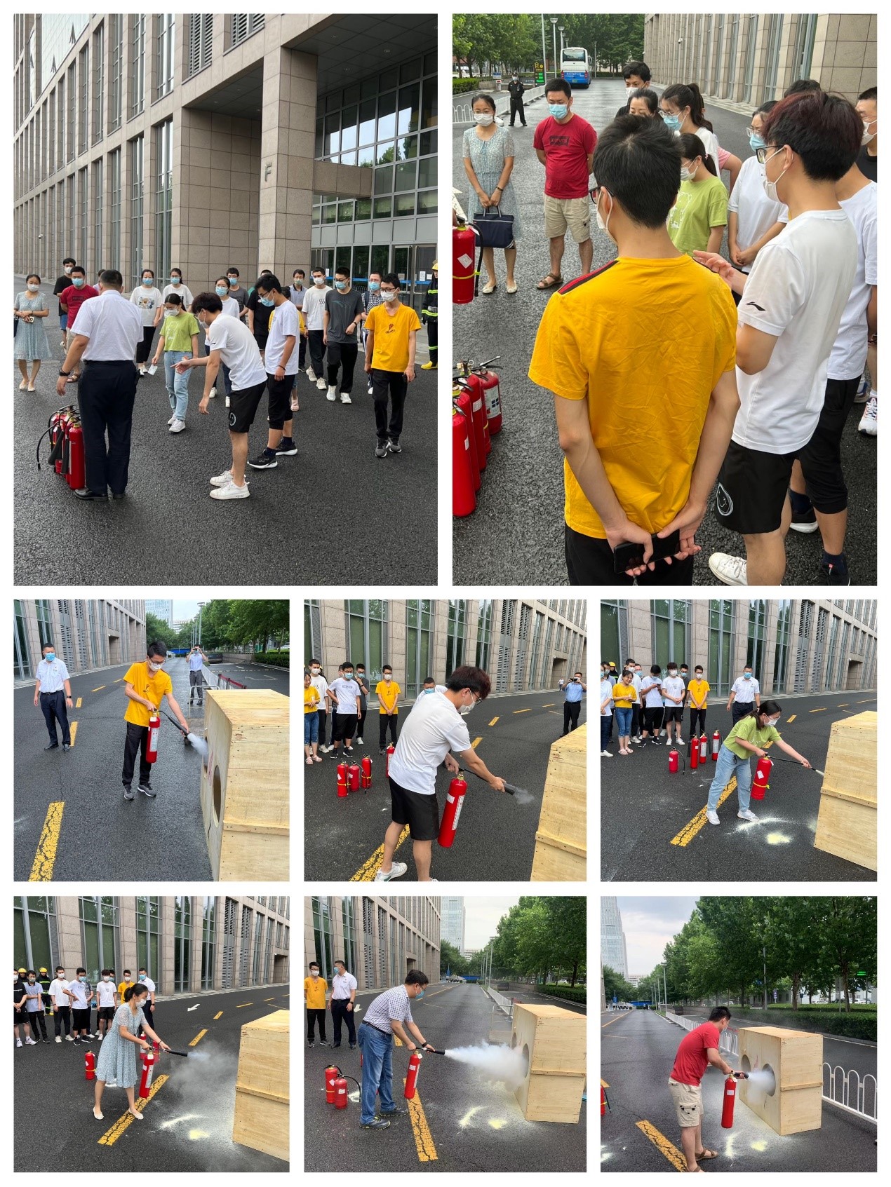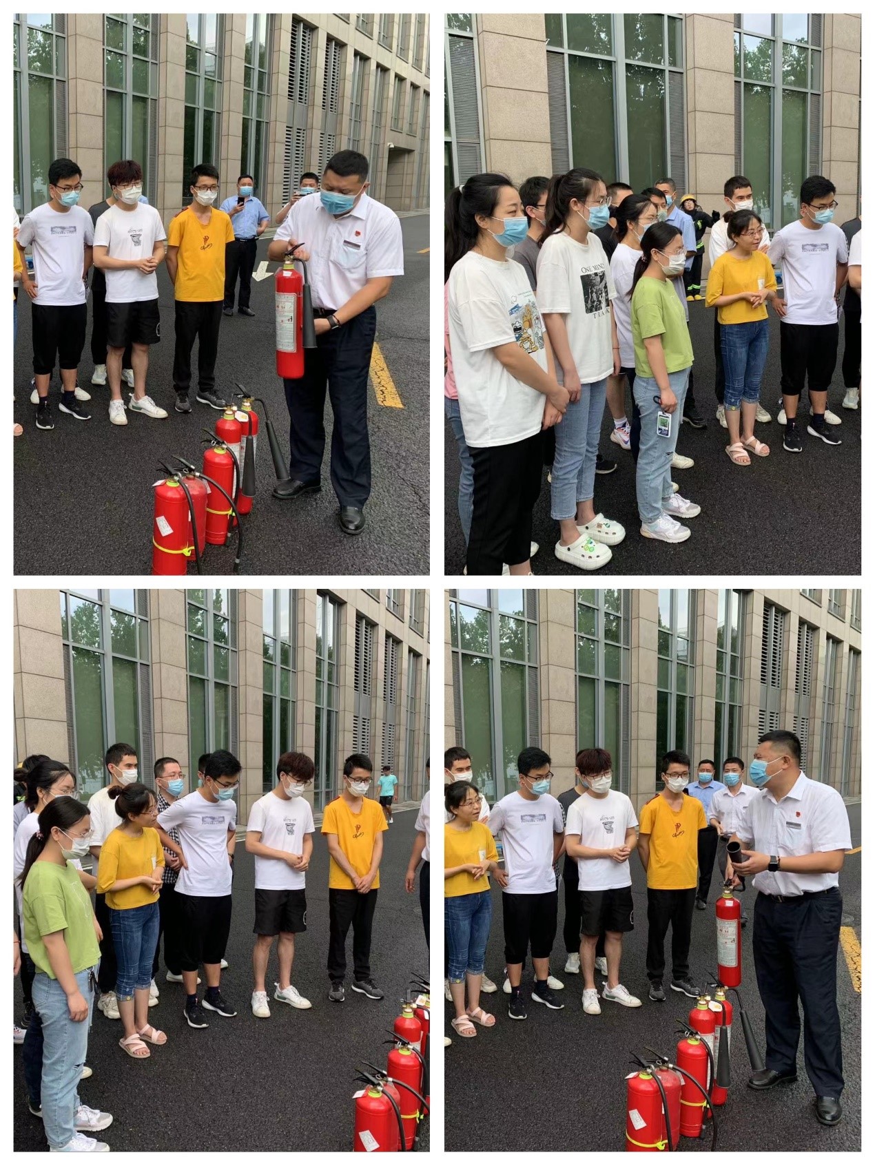疏散演习结束后,新主楼物业经理给现场师生详细讲解了干粉灭火器和二氧化碳灭火器的使用方法和要领。现场师生按照“1拔2握3瞄4压5扫”的灭火器使用口诀,逐一体验使用灭火器灭火过程,锻炼了评估判断火情和不同类别灭火器的使用能力。